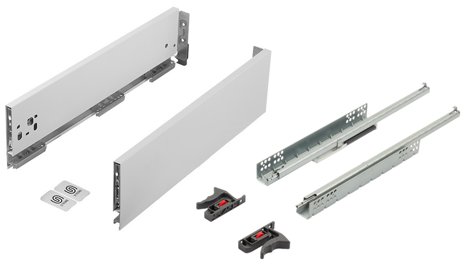 Kompletny zestaw okuć przeznaczony do złożenia szuflady StrongMax na ekonomicznych prowadnicach z pełnym wysuwem i cichym domykiem StrongRide Uni. Należy uzupełnić o przycięte elementy dna/tyłu oraz front. Grubość materiału dna/tyłu patrz nazwa kompletu (StrongMax Uni 16 / StrongMax Uni 18).