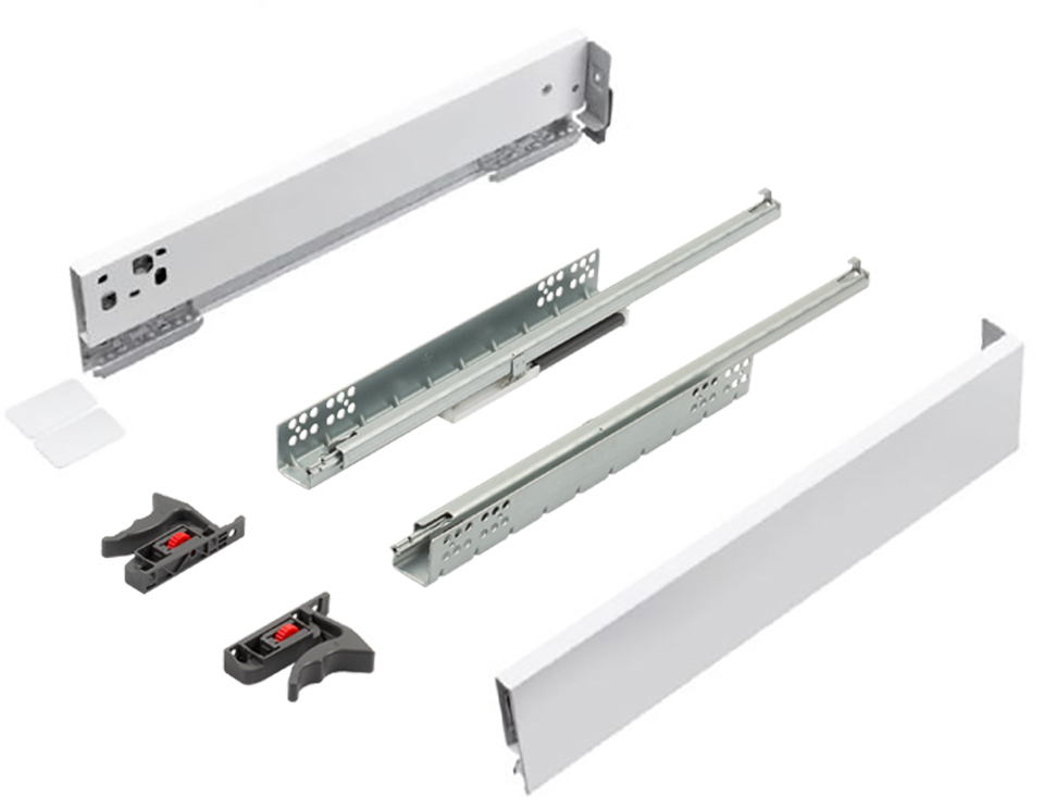 Kompletny zestaw okuć przeznaczony do złożenia szuflady StrongMax na ekonomicznych prowadnicach z pełnym wysuwem i cichym domykiem StrongRide Uni. Należy uzupełnić o przycięte elementy dna/tyłu oraz front. Grubość materiału dna/tyłu patrz nazwa kompletu (StrongMax Uni 16 / StrongMax Uni 18).