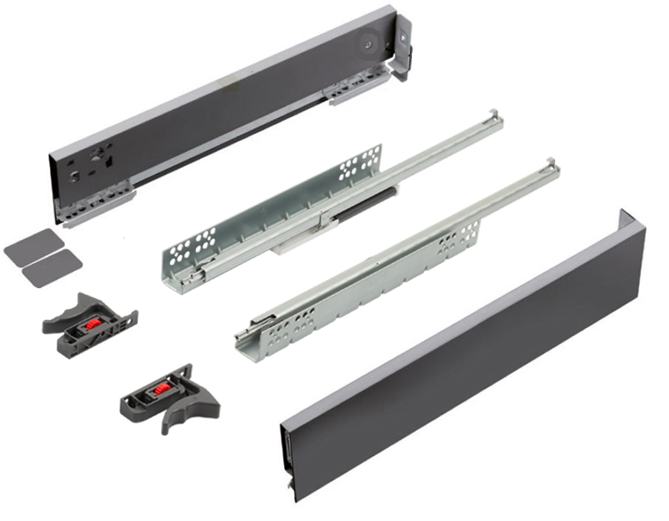 Kompletny zestaw okuć przeznaczony do złożenia szuflady StrongMax na ekonomicznych prowadnicach z pełnym wysuwem i cichym domykiem StrongRide Uni. Należy uzupełnić o przycięte elementy dna/tyłu oraz front. Grubość materiału dna/tyłu patrz nazwa kompletu (StrongMax Uni 16 / StrongMax Uni 18).