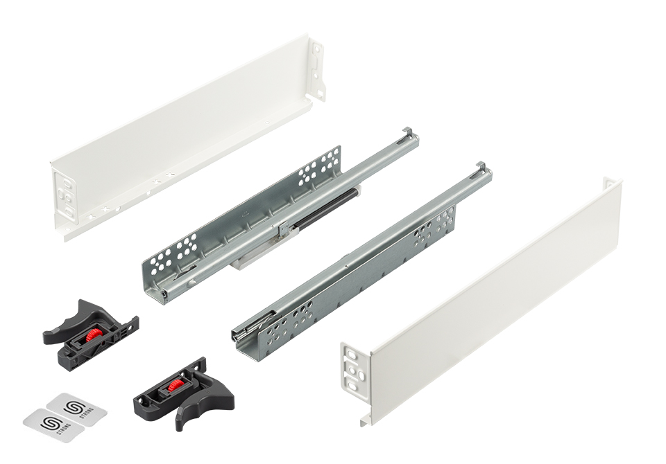 Kompletny zestaw okuć do montażu ekonomicznej szuflady boxowej z ekstremalnie cienkim metalowym bokiem (single-wall) o grubości 1 mm oraz ukrytymi prowadnicami z cichym domykiem. Oprócz frontu należy uzupełnić o przycięte elementy dna i tyłu (ta sama szerokość), można zastosować materiał o grubości 16 mm lub 18 mm.
