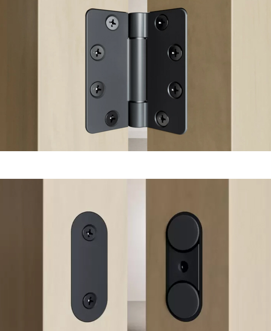 Zestaw okuć do pierwszego skrzydła dwuskrzydłowego. Zawiera dwa magnetyczne zatrzaski i trzy zawiasy drzwiowe. Wersja bez toru dolnego. Do drzwi o wysokości maks. 2400mm, nośność 80kg/1 skrzydło. W przypadku czterech drzwi - 40 kg/1 skrzydło, sześciu drzwi - 25 - 30 kg/1 skrzydło. Grubość materiału 35 - 45 mm. Kolor czarny (malowany proszkowo).