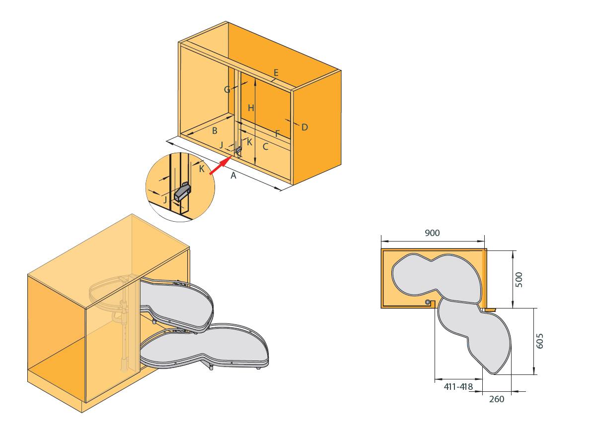 Komplet półek Arena STYLE (drut płaski) do dolnych szafek narożnych. Do LeMans II można dodać zewnętrzne tłumienie, które tłumi półkę przy zamykaniu. Dno z powierzchnią antypoślizgową Anti-slip. Do korpusu 900 mm. Montaż tłumienia na zewnętrznym ramieniu. Wewnętrzne rozmiary korpusu: szerokość: 860, głębokość 500, wysokość: 600-750 ewentualnie 720-900 mm. Minimalny rozmiar drzwi 411 mm. Drążek montażowy + mocowanie na bok - 160132 (600-750 mm), obciążenie półki 20 kg.