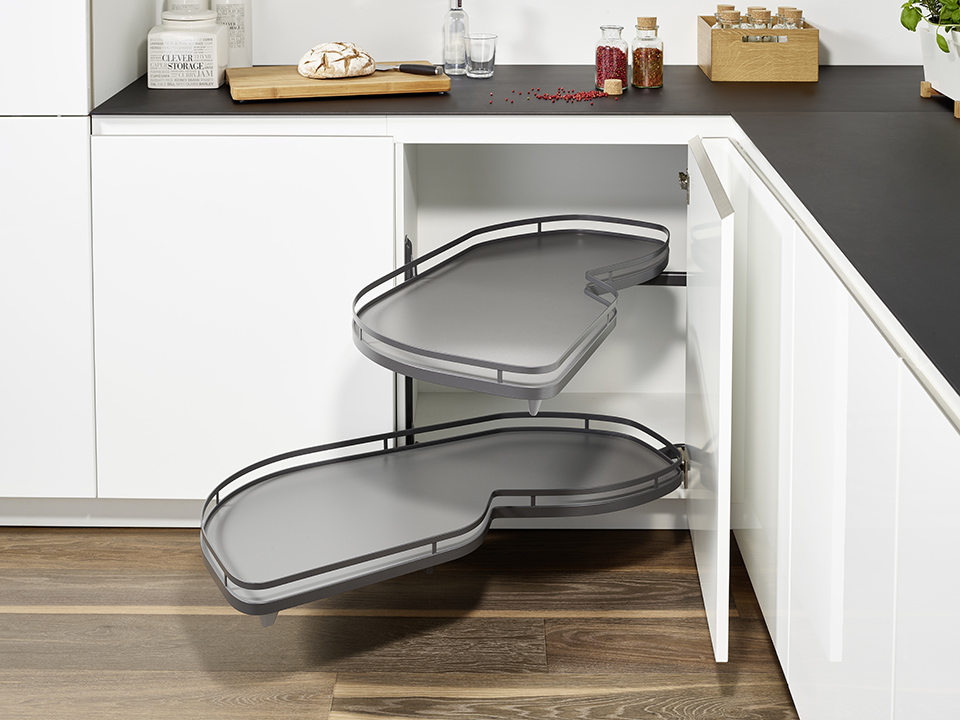 Kpl. półek Arena STYLE antracyt do narożnych szafek dolnych (tzw. ślepy kąt) LeMans II. Dno z Anti-slip z antyposlizgowym wykończeniem. Do LeMansu II można dołożyć tłumienie, który tłumi półkę przy zamykaniu. Do korpusu 1000mm. Montaż tłumienia na zewnętrznym ramieniu. Dobry produkt: Wiadomo, że produkty Kesseböhmer to przemyślane produkty o wartości dodanej. My uważamy, że rozwiązanie w kolorze antracytowym jest wyjątkowo udane. W meblu subtelne i bardzo eleganckie. Można go łatwo kombinować z modnym ciemnym okuciem (prowadnice, zawiasy...) oraz większością płyt.
