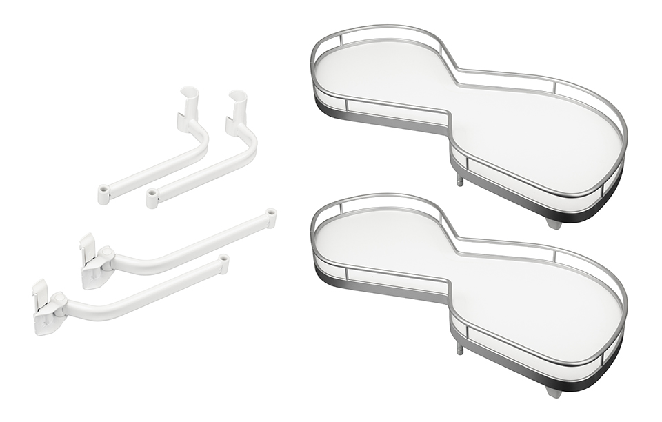Kpl. półek Arena CLASSIC do dolnej szafki narożnej LeMans II SREBRNO-BIAŁY . Dno z powierzchnią antypoślizgową Anti-slip. Do LeMans II można dodać tłumienie zewnętrzne, które półkę dociągnie, przy zamykaniu dotłumi i zabezpieczy przed uderzeniem. Do korpusu 1000mm. Montaż tłumienia na zewnętrznym ramieniu. Wewnętrzne rozmiary korpusu: szerokość: 960, głębokość 500, wysokość: 600-750mm ewentualnie 720-900mm. Minimalny rozmiar drzwi 461-468mm. Drążek montażowy + mocowanie na boku korpusu - 160132, tłumienie zewnętrzne na prawą wersję - 318463. Obciążenie półek 25kg.