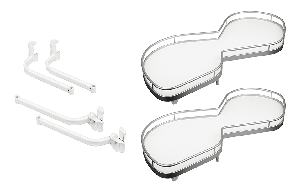 Kpl. półek Arena CLASSIC SREBRNO-BIAŁY do dolnej szafki narożnej LeMans II. Dno z powierzchnią antypoślizgową Anti-slip. Do LeMans II można dodać tłumienie zewnętrzne, które półkę dociągnie, przy zamykaniu dotłumi i zabezpieczy przed uderzeniem. Do korpusu 1000mm. Montaż tłumienia na zewnętrznym ramieniu. Wewnętrzne rozmiary korpusu: szerokość: 960, głębokość 500, wysokość: 600-750mm ewentualnie 720-900mm. Minimalny rozmiar drzwi 561-568mm. Drążek montażowy + mocowanie na boku korpusu - 160132, tłumienie zewnętrzne na lewą wersję - 318464. Obciążenie półek 25kg.