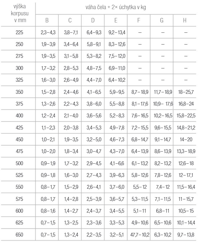 | Wysokość korpusu (mm) | 200 - 650 |