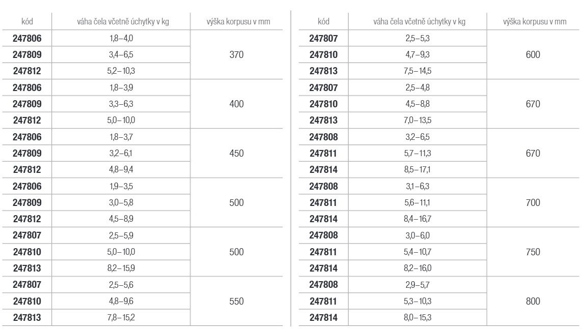 | Wysokość korpusu (mm) | 670 - 800 |