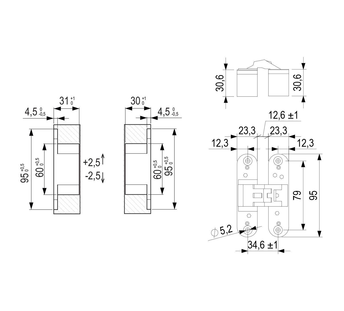 Zawias do drzwi bezprzylgowych z regulacją 3D. Wysokość +/-2,5mm, przód/tył +3/-2mm, na boki +/- 1mm. Maksymalna nośność drzwi 45 kg na 2 szt zawiasów (60 kg na 3 szt). Ognioodporne wykonanie zawiasu wg normy ANSI/UL 10C. Szablon montażowy 256045 (rama) + 256048 (wkłady)