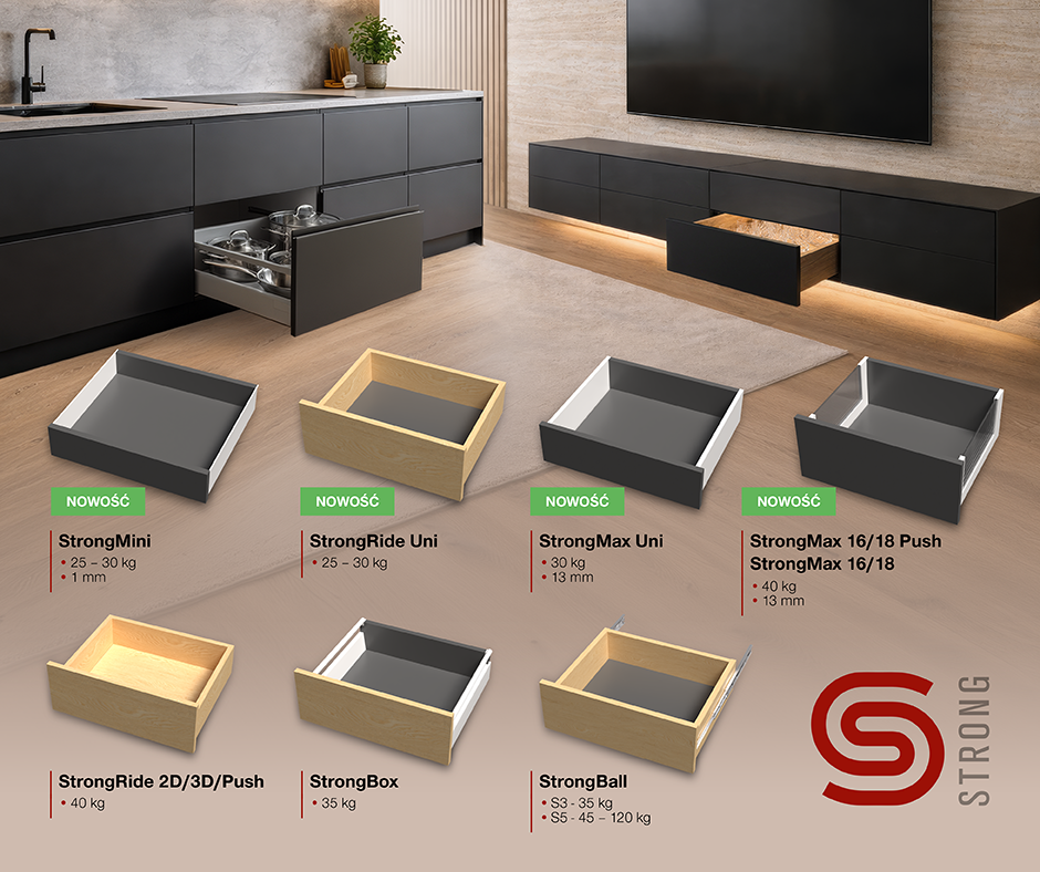 Wraz z rozwojem oferty Strong uporządkowaliśmy systemy szuflad i prowadnic tak, aby ich dobór był jeszcze prostszy i bardziej intuicyjny – niezależnie od rodzaju projektu. Wszystkie rozwiązania, w tym najnowsze systemy, zostały zebrane w nowej broszurze „Prowadnice, które mają MOC”, która w jednym miejscu pokazuje pełną ofertę marki Strong i ułatwia szybkie porównanie dostępnych wariantów.