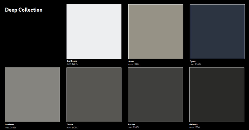 Wzornik kolekcji Rauvisio Crystal "DEEP" - flip card A4. Wzornik zawiera próbki o wymiarach 80 x 80 mm.