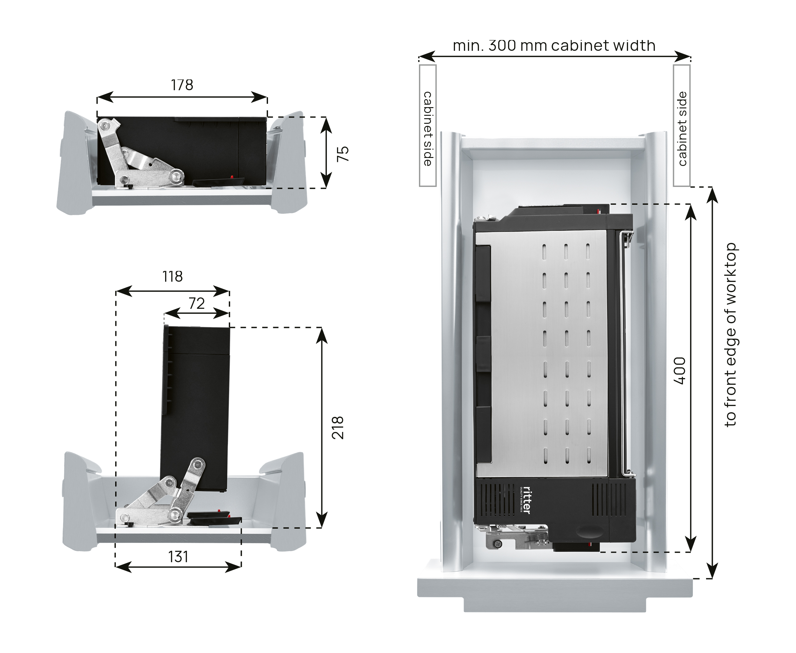 Wbudowany toster do montażu w szufladach kuchennych o minimalnej szerokości korpusu 30 cm. Wymiary H: 75 mm W: 178 mm D: 400