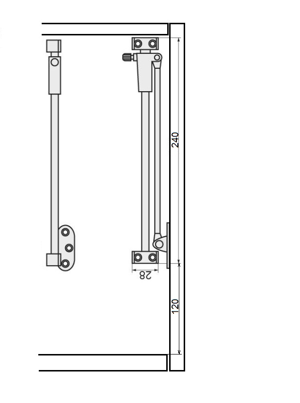 Mechanizm hamujący z regulowanym działaniem hamulca dla dolnej klapy. Regulacja za pomocą plastikowej śruby. Materiał: stal chromowana i biały plastik. Minimalna wysokość wewnętrzna korpusu: 360 mm.