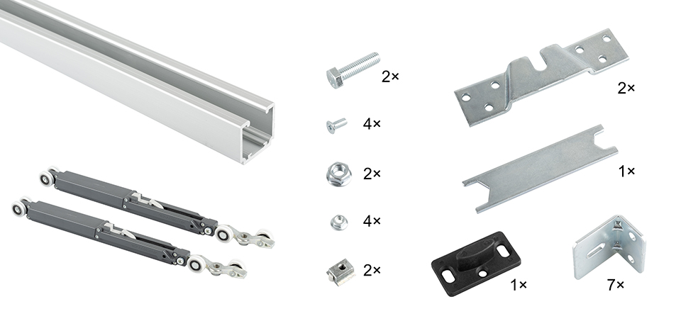 Sada kování pro jedno křídlo s tlumením. Včetně horního vedení o délce 2000mm a příchytů na zeď. Nosnost: 40 kg. Baleno v tubusu. .