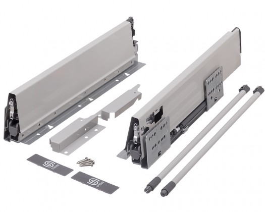 Prowadnica z tłumieniem i pustym bokiem wraz z 1 kpl. relingów. Długość 400mm, wysokość 140(165mm). Obciążenie do 35kg. Kolor szary. Wszystkie elementy potrzebne do skompletowania całej szuflady w zestawie. Do szuflady wewnetrznej należy dodatkowo zamówić przedni panel w zależności od szerokości korpusu.