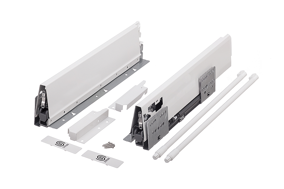 Prowadnica z tłumieniem i pustym bokiem wraz z 1 kpl. relingów. Długość 270mm, wysokość 204 (225mm). Obciążenie do 35kg. Kolor biały. Wszystkie elementy potrzebne do skompletowania całej szuflady znajdują się w zestawie. W przypadku szuflady wewnętrznej należy dodatkowo zastosować przedni panel w zależności od szerokości.
