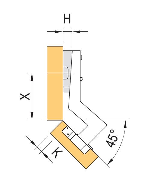 Zawias KLIP 45° na wkręt z integrowanym tłumieniem. Kąt otwarcia 110°. Rozstaw wkrętów 45mm i 9,5mm od środka miski . Miska 35mm. Montaż i demontaż bez użycia narzędzi. Polecane prowadniki: H0 wkręt 92590T, H2 Euro 92591T; H2 wkręt 92592T, H2 Euro 92593T.