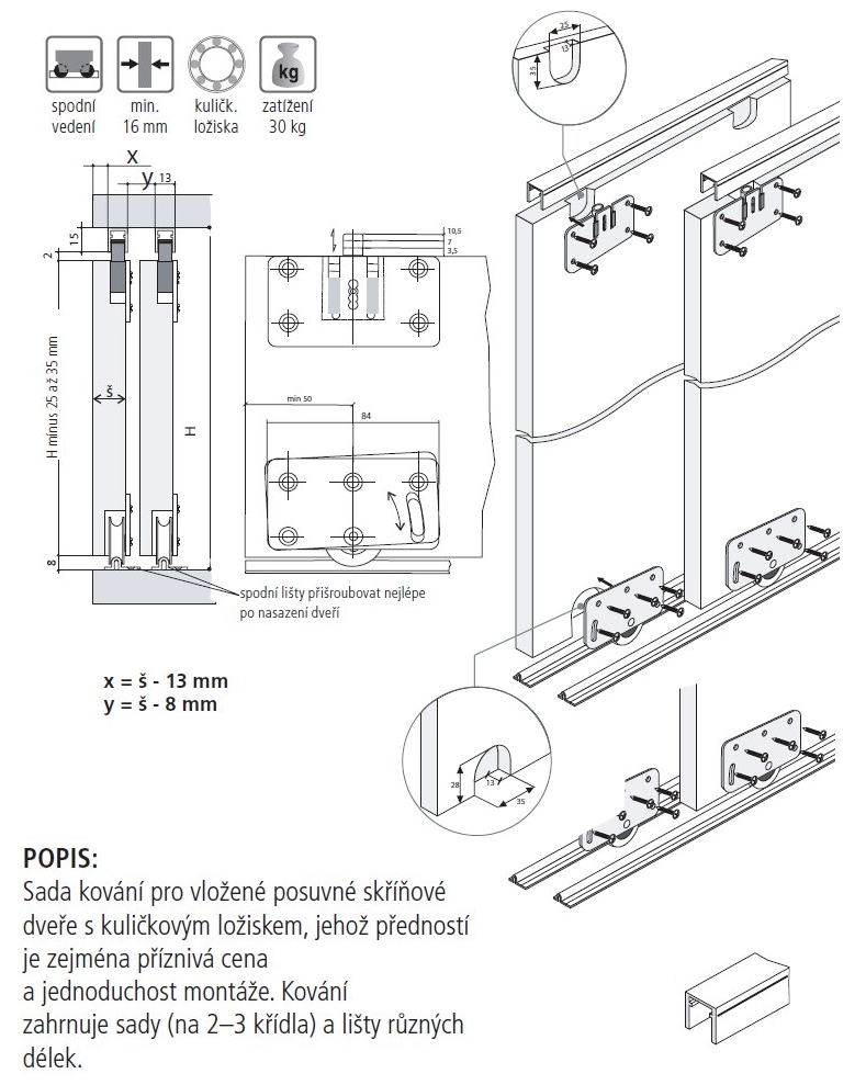 okucie na przesuwane drzwi, nośność 30kg/drzwi, komplet na 3 drzwi.