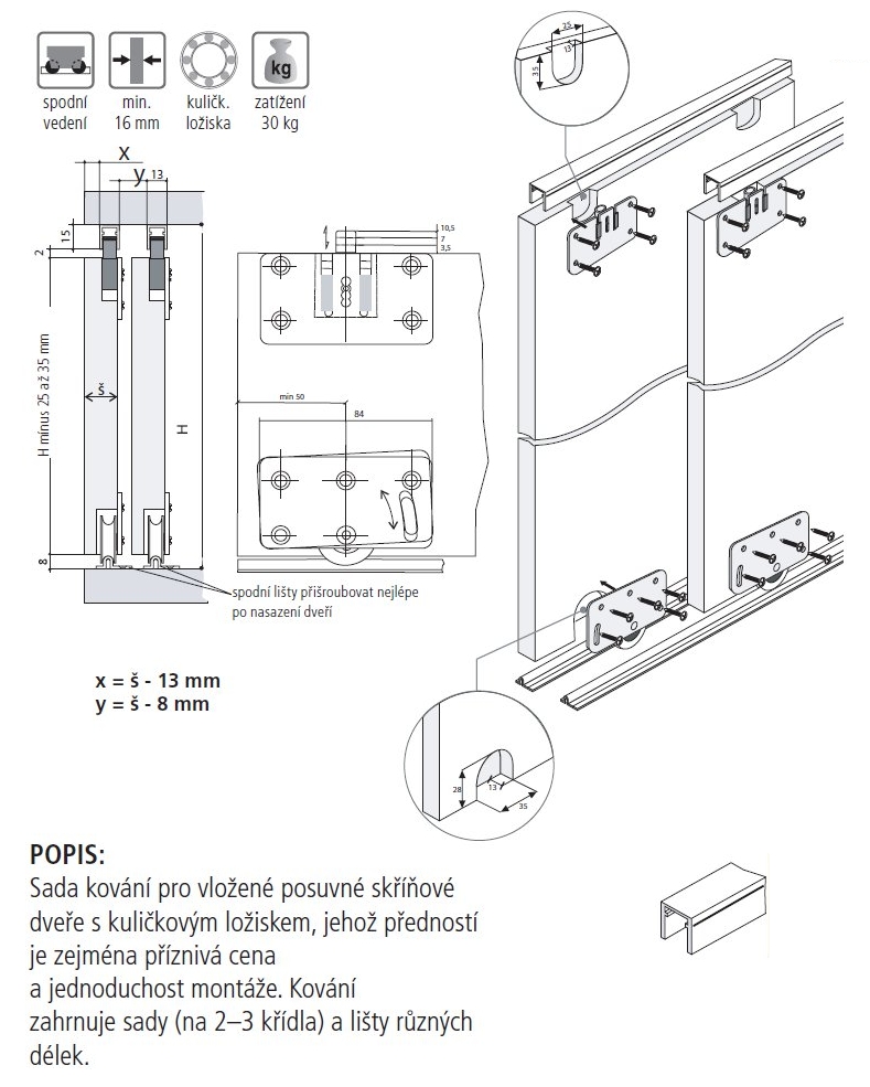 okucie na przesuwane drzwi, nośność 30kg/drzwi, komplet na parę drzwi.