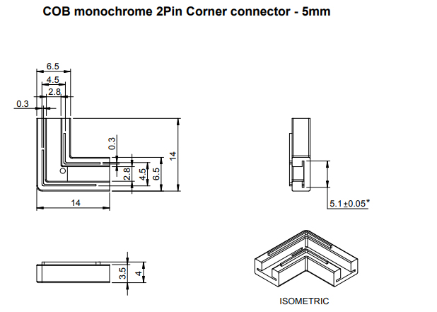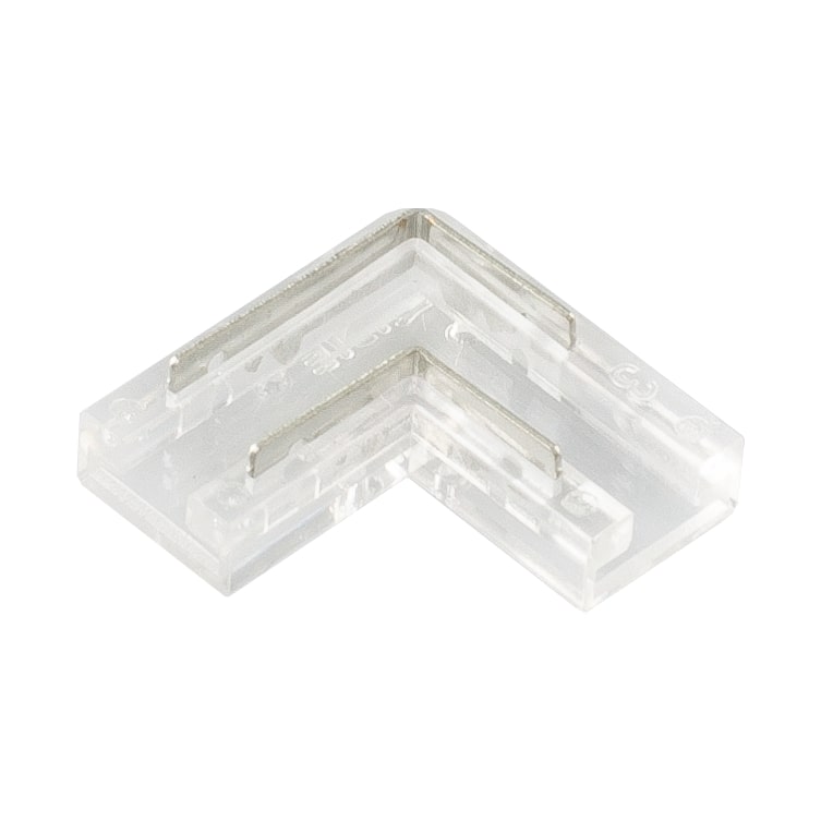 Kątowa złączka do łączenia taśmy COB LED – taśma LED. Odpowiednia do taśm LED o szerokości 5 mm, patrz powiązany asortyment. Złączkę nasuwa się na taśmę LED i za pomocą kleszczy dociska piny kontaktowe do taśmy LED, które następnie wbiją się w taśmę LED. Złączka jest przeznaczona do jednorazowego użytku. Taśmy LED muszą się pokrywać w miejscu wewnętrznego kąta, patrz zdjęcie. Do stosowania w profilach o minimalnej szerokości 7 mm i wysokości 5,1 mm.