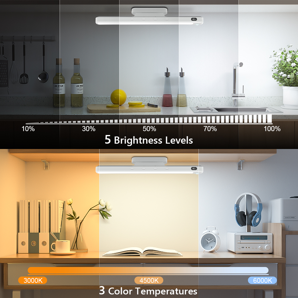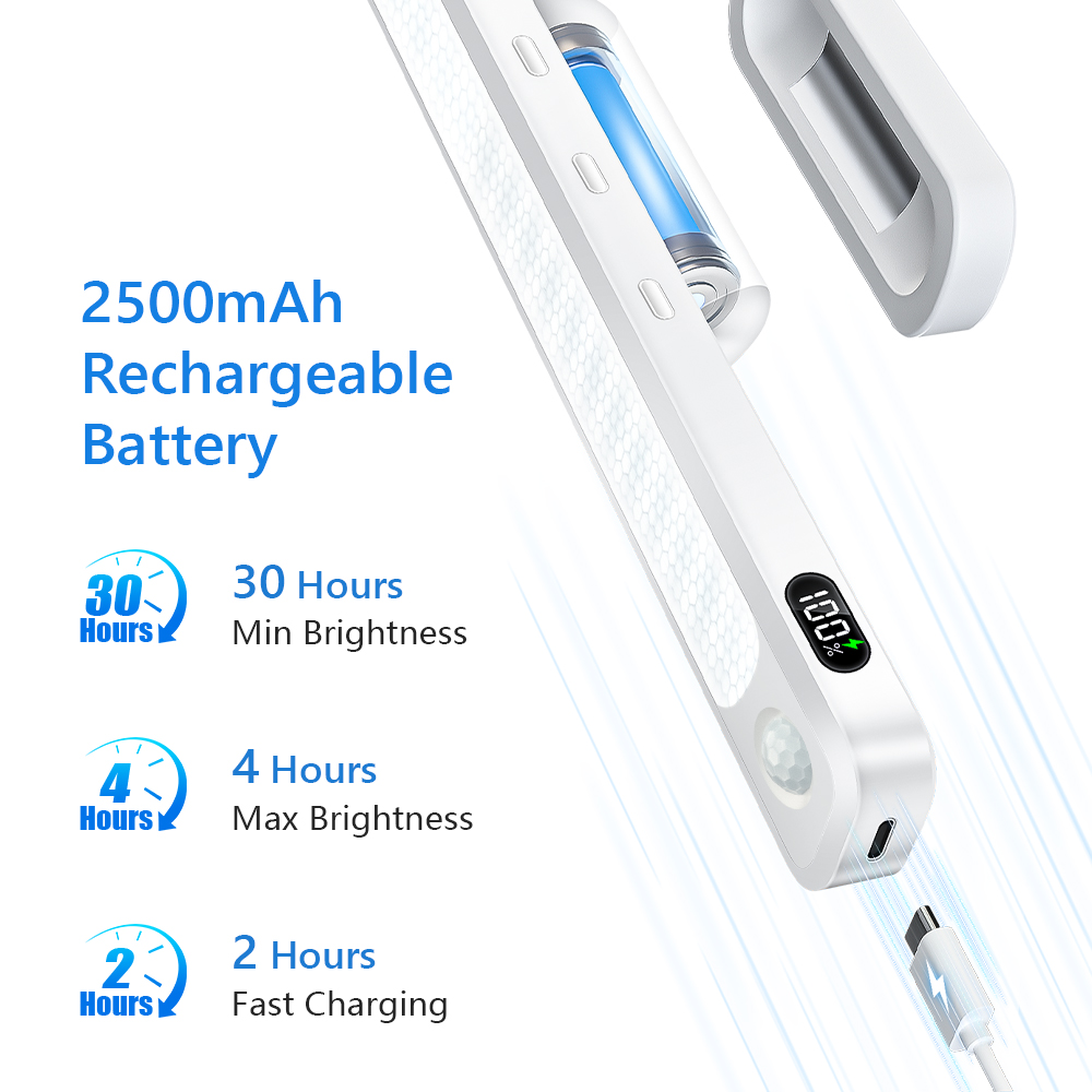 LED svítidlo s pohybovým senzorem. Světlo se automaticky rozsvítí po detekci lidského pohybu v temném prostředí (<20 lx) a po cca 20 sekundách se vypne, není-li zaznamenán další pohyb. V osvětleném prostředí světlo při zapnutí automatického režimu svítí a po cca 3 sekundách zhasne, dokud se nesetmí a zároveň senzor nedetekuje pohyb. Popis: PIR senzor s úhlem snímání 120° a dosahem 3 m. Tlačítko pro manuální ovládání. 5 úrovní jasu a 3 úrovně teploty světla (CCT). Vestavěná baterie k nabíjení přes USB-C kabel. Digitální ukazatel stavu baterie. Světelný zdroj: 96 LED diod (2x 48). Výkon: 5 W, svítivost +-430 lm.Kapacita baterie: 2500 mAh. Rozsah CCT: 3000 K - 4500 K - 6000 K. Rozměry: 300 × 33 × 20 mm. Barva bílá. Balení obsahuje: Nastavitelný magnetický příchyt - 2x, nabíjecí USB-C kabel.