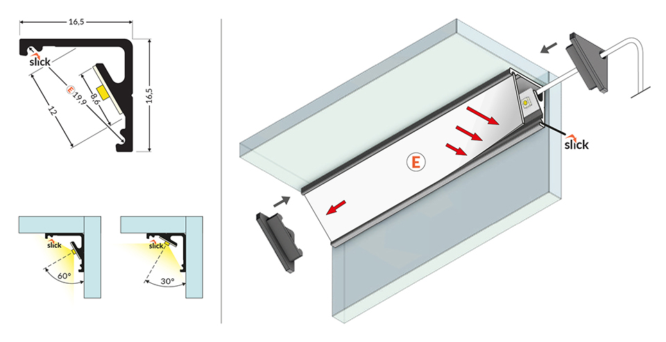 narożny profil z dużą powierzchnią rozproszenia światła, kąt promienia świetlnego 30° / 60° umożliwia skierowanie prądu świetlnego według potrzeby. Taśmy ledowe do szerokości 12 mm, dobry odpływ ciepła..