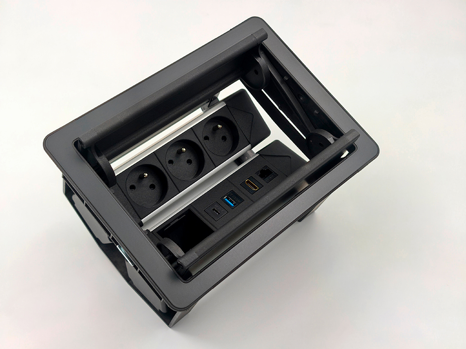 Dvojité otevírací víko s jedním nebo dvěma zásuvkovými moduly uvnitř Po zavření zůstane upropstřed mezera na průchod kabelů