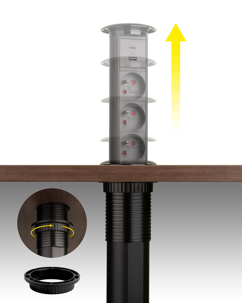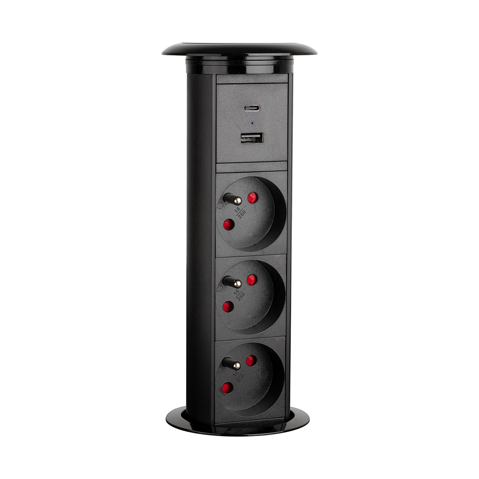STRONG wysuwane gniazdko elektryczne, czarno-białe 3 x 230 V typ francuski z bolcem uziemiającym (standard dla CZ, SK a PL)