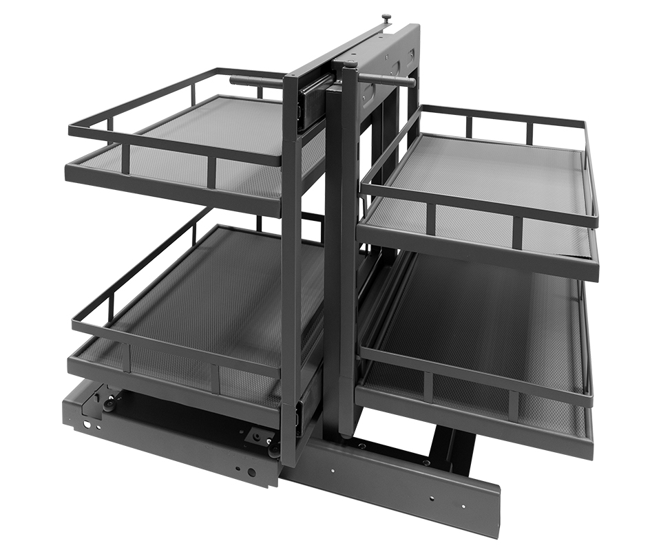 Uniwersalny mechanizm (prawo-lewy) do zastosowania w dolnym rogu, dla korpusów o wymiarze zewnętrznym 900–1000 mm. Umożliwia wysunięcie tylnych koszy przed korpus.