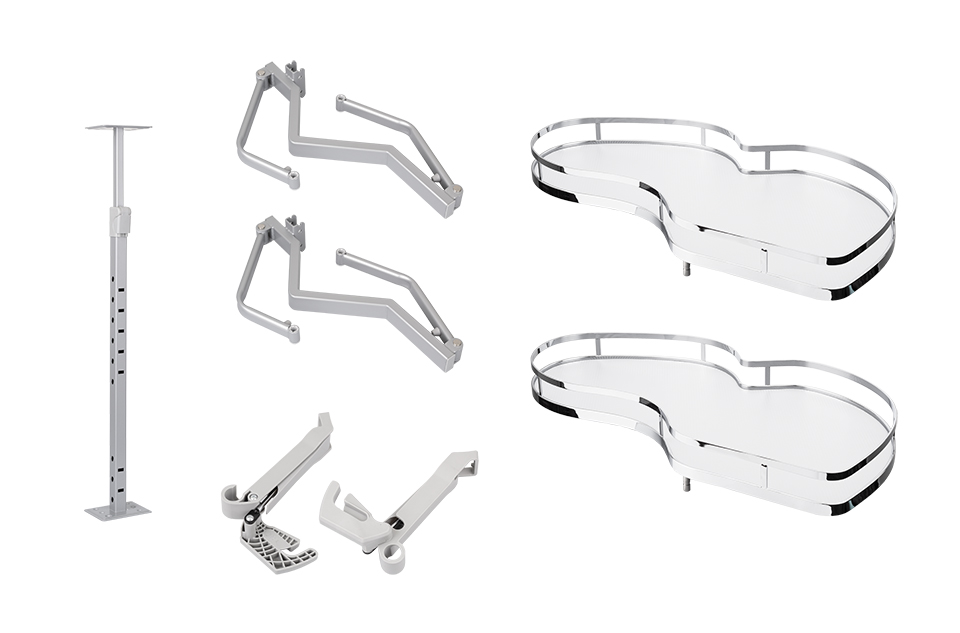 Set of 2 pull-out shelves for the lower corner cabinet. The right option when closing with damping. For a body width of 900 mm. Set including arms and mounting elements for fastening to the body.