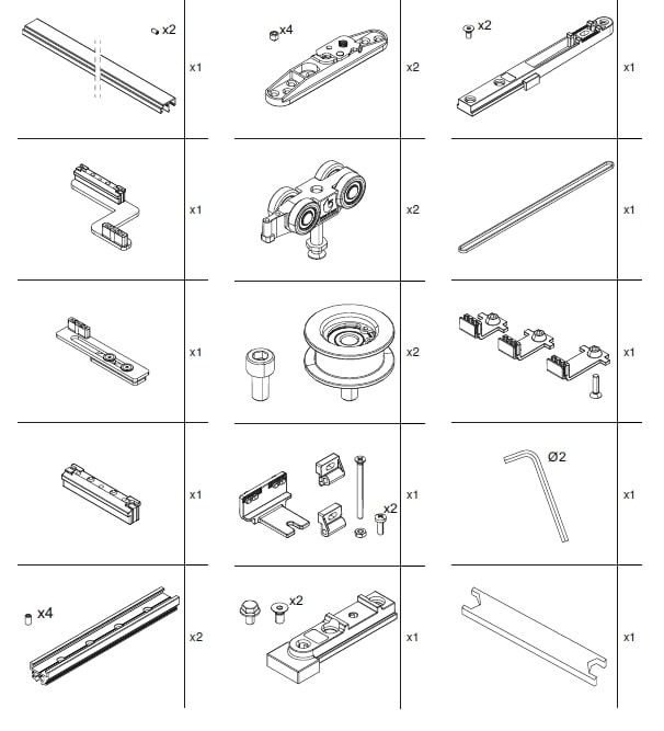 Zestaw okuć do skrzydła środkowego. Minimalna szerokość skrzydła: 600 mm. Przeznaczony do systemu ramowego okuć T-Belt Universal.