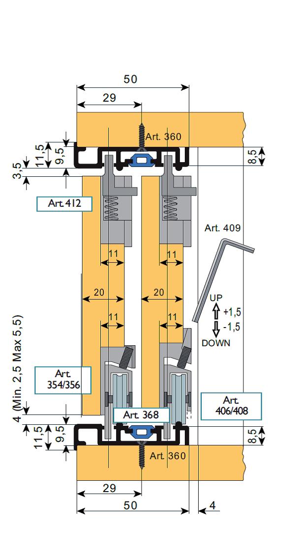 Tor do zestawu okuć z łożyskiem do wkładanych drzwi przesuwanych o wadze maks. 30 kg. Do okucia można wykorzystać profile do zafrezowania (DT391,2,5), jak i podwójne profile na wkręt (DT397-9). W celu zamaskowania wkrętów należy wykorzystać plastikową listwę DT387.
