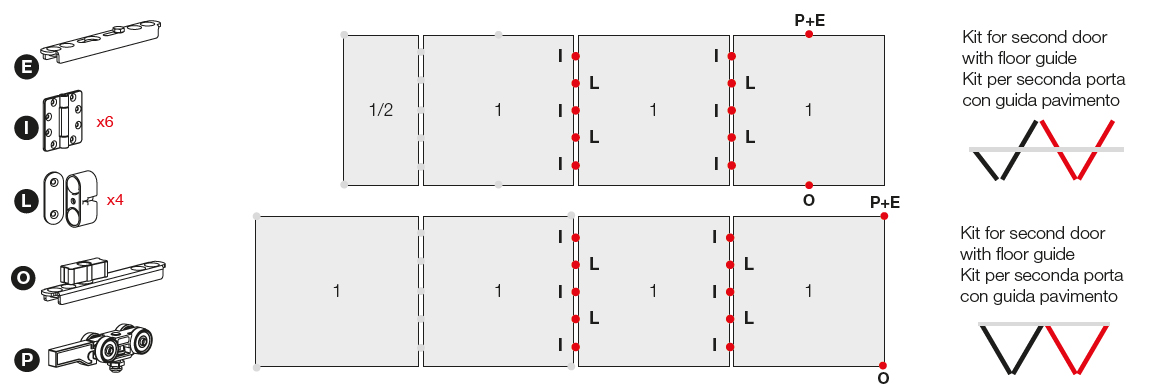 Sada kování pro posuvné dvojkřídlo. Obsahuje čtyři magnetické aretace a šest mezidveřních závěsů. Verze se spodním vedením. Pro výšku dveří max. 2400mm, nosnost 40kg/1 křídlo. V případě šesti dveří - 25 - 30kg/1 křídlo. Tloušťka materiálu 35 - 45mm. Barva černá (práškově lakovaná).