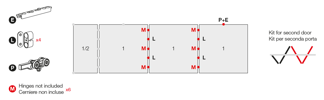 Zestaw okuć do pierwszych drzwi podwójnych. Zawiera trzy zaczepy magnetyczne, bez zawiasów składanych i międzydrzwiowych. Wersja bez dolnej prowadnicy. Do drzwi o wysokości maks. 2400mm, nośność 80kg/1 skrzydło. W przypadku czterech drzwi - 40kg/1 skrzydło, sześciu drzwi - 25-30kg/1 skrzydło. Grubość materiału 35-45mm. Kolor czarny (malowany proszkowo). https://www.ternoscorrevoli.com/pl/catalogue/systemy-drzwiprzesuwnych/versatile. Szczegóły produktu na stronie producenta.