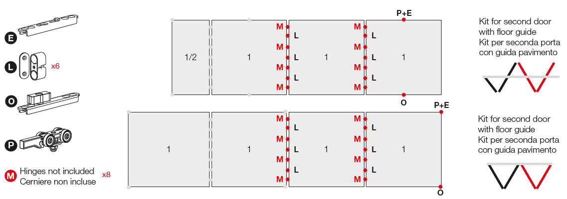 Zestaw okuć do pierwszych drzwi podwójnych. Zawiera trzy zaczepy magnetyczne, bez zawiasów składanych i międzydrzwiowych. Wersja bez dolnej prowadnicy. Do drzwi o wysokości maks. 2400mm, nośność 80kg/1 skrzydło. W przypadku czterech drzwi - 40kg/1 skrzydło, sześciu drzwi - 25-30kg/1 skrzydło. Grubość materiału 35-45mm. Kolor czarny (malowany proszkowo). https://www.ternoscorrevoli.com/pl/catalogue/systemy-drzwiprzesuwnych/versatile. Szczegóły produktu na stronie producenta.