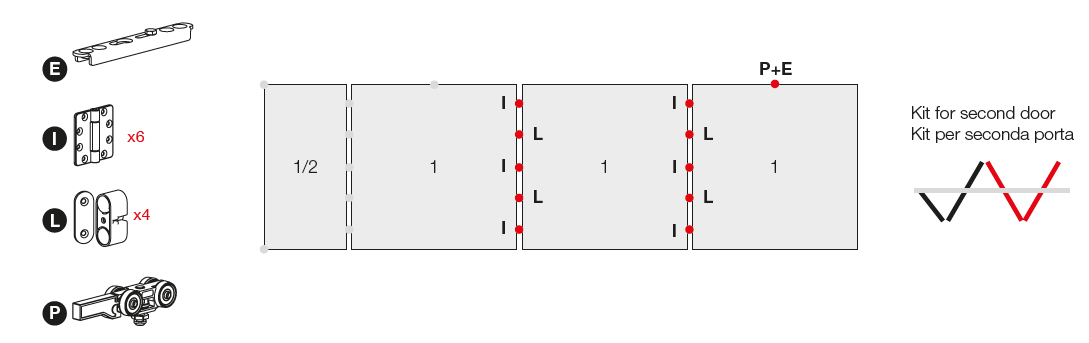Sada kování pro posuvné dvojkřídlo. Obsahuje čtyři magnetické aretace a šest mezidveřních závěsů. Verze bez spodního vedení. Pro výšku dveří max. 2400mm, nosnost 40kg/1 křídlo. V případě šesti dveří - 25 - 30kg/1 křídlo. Tloušťka materiálu 35 - 45mm. Barva černá (práškově lakovaná).