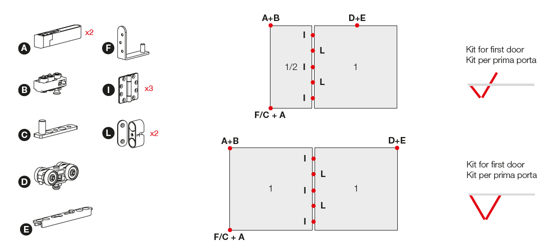 Zestaw okuć do pierwszego skrzydła dwuskrzydłowego. Zawiera dwa magnetyczne zatrzaski i trzy zawiasy drzwiowe. Wersja bez toru dolnego. Do drzwi o wysokości maks. 2400mm, nośność 80kg/1 skrzydło. W przypadku czterech drzwi - 40 kg/1 skrzydło, sześciu drzwi - 25 - 30 kg/1 skrzydło. Grubość materiału 35 - 45 mm. Kolor czarny (malowany proszkowo).