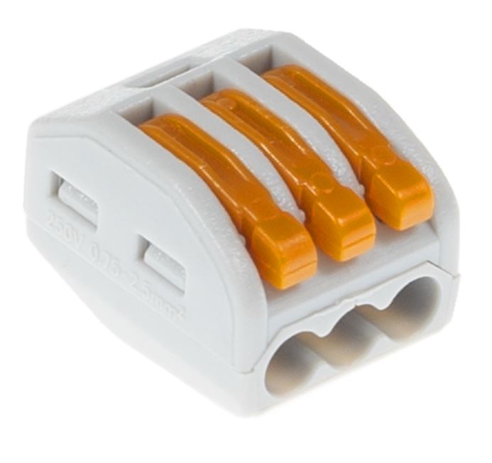Zaciski 3 przewodowe z dźwignią do łatwego montażu i demontażu kabli. Wszystkie 3 wejścia są połączone w złączu jako jedno połączenie. (nie służy do podłączenia 3 niezależnych połączeń). 400V / 32A Średnica kabla 0,75 - 2,5 mm2