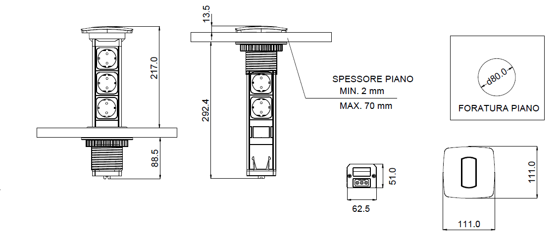 System z 3 el. gniazdkami, umieszcza się go zazwyczaj w blacie o grubości min. 2 mm a max. 70 mm (otwór montażowy o średnicy 80mm). System wysuwa się mechanicznie. Obudowa systemu wyprodukowana jest z aluminium. W celu podłączenia do sieci elekt. należy zakupić kabel zasilający. Długość 2m (kod 179748) lub długość 3m (kod 179749).