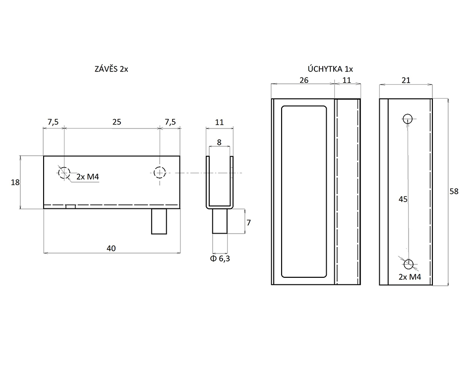 Kpl. dwóch zawiasów czopikowych do szklanych drzwiczek bez ramy z uchwytem. Do szkła o maksymalnej grubości 5 mm.
