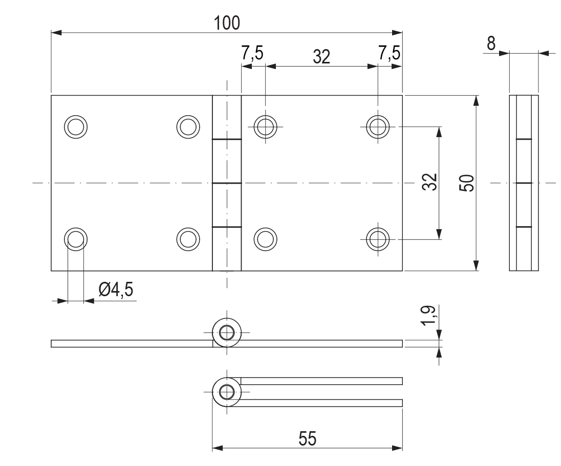 zawias 50x50mm, w stanie otwartym 100x50mm. na każdej połówce znajdują się 4 otwory o średnicy 7 mm, rozstaw otworów 32 mm, średnica zewnętrzna trzpienia i grubość zawiasu w stanie zamkniętym 8 mm. Grubość blachy 1,8 mm